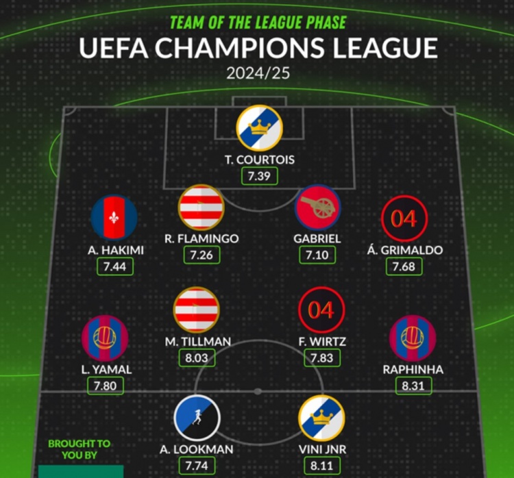前鋒:盧克曼(亞特蘭大,7.74分)、維尼修斯(皇馬,8.11分)