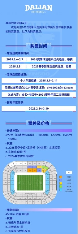 2月6日訊 大連英博俱樂部發(fā)布2025賽季票務公告,開啟新賽季票務出售。