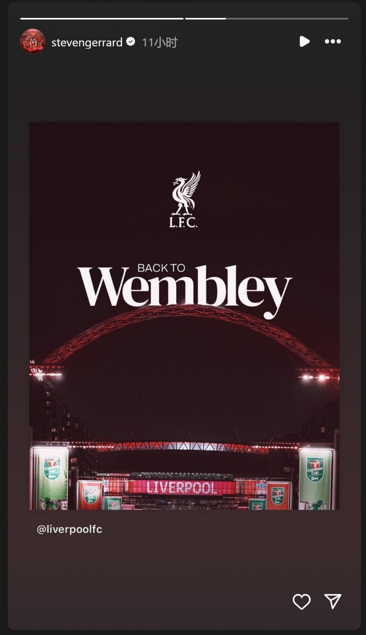 利物浦傳奇球星杰拉德更新社媒動(dòng)態(tài),曬出利物浦重返溫布利(決賽場(chǎng)地)的海報(bào),祝賀老東家晉級(jí)聯(lián)賽杯決賽。