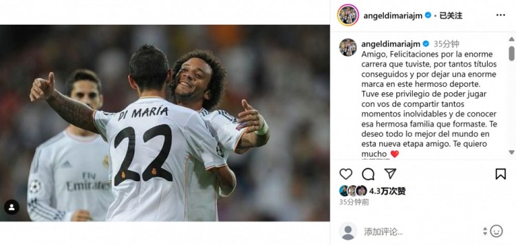 2月7日訊 巴西傳奇球星馬塞洛宣布退役,他在皇馬效力時期的隊友迪馬利亞也在社媒曬出昔日合影為其送上祝福。迪馬利亞寫道:“我的朋友,祝賀你擁有如此偉大的職業(yè)生涯,贏得了如此多的冠軍,給足球這項美麗的運動留下自己的印記。很榮幸我曾經(jīng)與你并肩作戰(zhàn),一起分享無數(shù)難忘的回憶,與你組建的家庭相識。祝你在人生新的階段一切順利,我的朋友,我是如此愛你?!?/p> 本文標簽: 足球 西甲 皇家馬德里 五洲 葡超