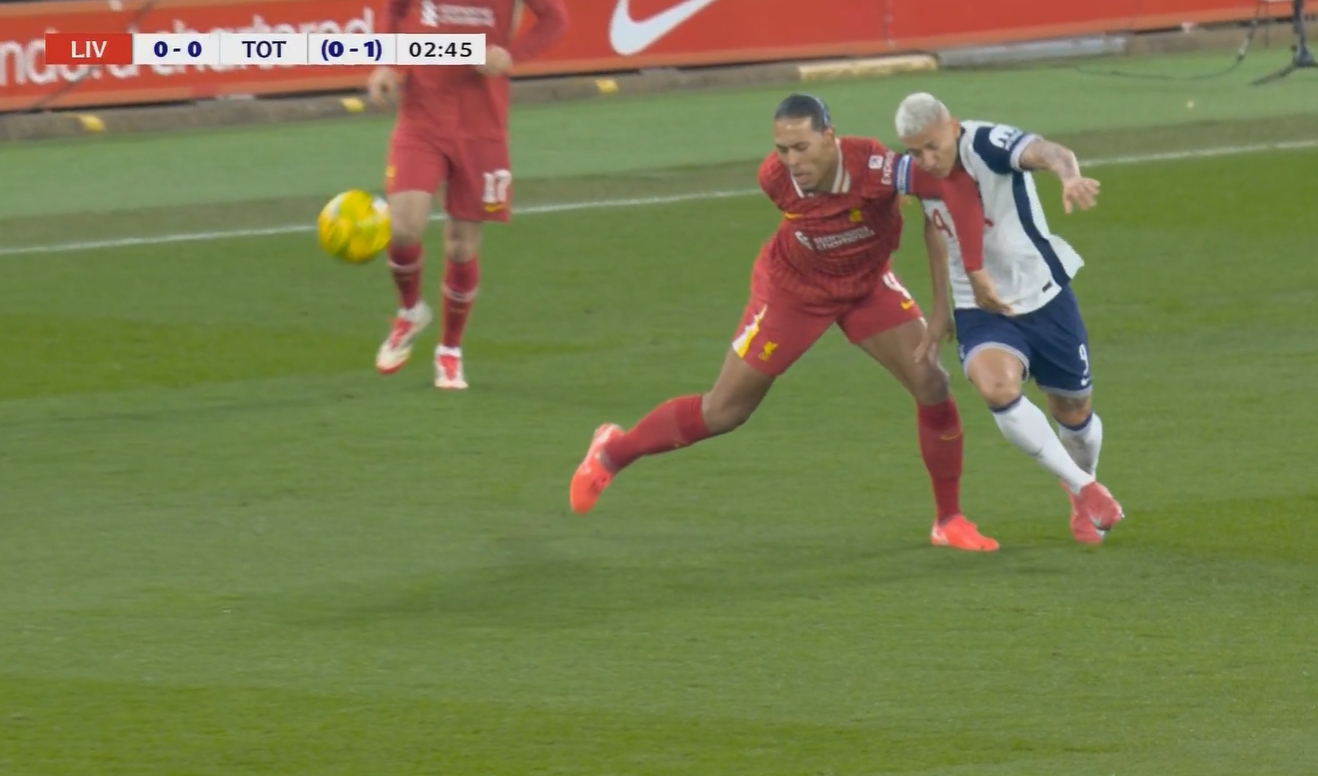比賽開場2分鐘,范迪克在一次拼搶中肘擊理查利森,但裁判不認為這是一次犯規(guī)。
