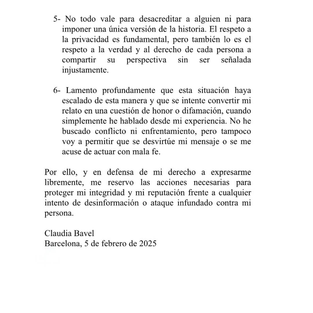 克勞迪婭-巴維爾隨后也給出了自己的回應(yīng),她表示:“鑒于最近的事件和公開聲明,我覺得有必要表達(dá)以下觀點(diǎn)。和任何人一樣,我有權(quán)分享我的經(jīng)歷,而不意味著侵犯他人的隱私。我一直對(duì)我的社區(qū)和關(guān)注我的人保持透明,從未試圖用我的言辭傷害任何人?!?/p>
