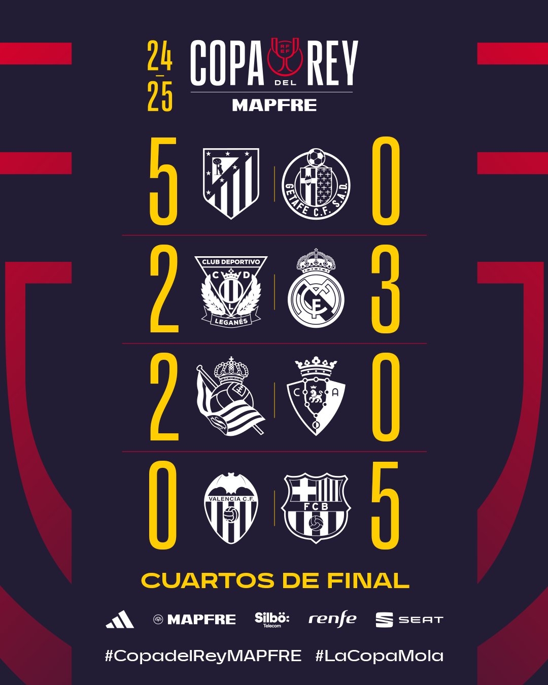 02月07日訊 今日凌晨國王杯8強賽,巴薩5-0大勝瓦倫西亞,與皇馬、馬競、皇社共同晉級4強。皇薩競三隊全部晉級國王杯4強,無人掉隊。在西甲聯(lián)賽方面,三隊也是目前的西甲前三,均是奪冠的大熱門。在歐冠賽場上,巴薩和馬競已經(jīng)直通歐冠16強,只有皇馬需要打附加賽,白衣軍團的對手是英超豪門曼城。 本文標簽: 足球 西甲 皇家馬德里 巴塞羅那 馬德里競技