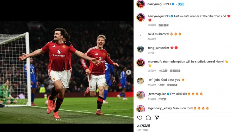 2月8日訊 曼聯(lián)在本輪足總杯2-1絕殺萊斯特城,馬奎爾在補時階段打進明顯越位球。第90+3分鐘,曼聯(lián)左路定位球機會。B費主罰開到后點,馬奎爾頭球破門。進球明顯越位,不過足總杯第4輪沒有VAR,邊裁第一時間沒有舉旗,進球有效。馬奎爾也在賽后通過社媒曬出自己的慶祝照,并配文:“在老特拉福德最后一刻打進制勝球!” 本文標簽: 足球 英超 曼聯(lián) 萊斯特城