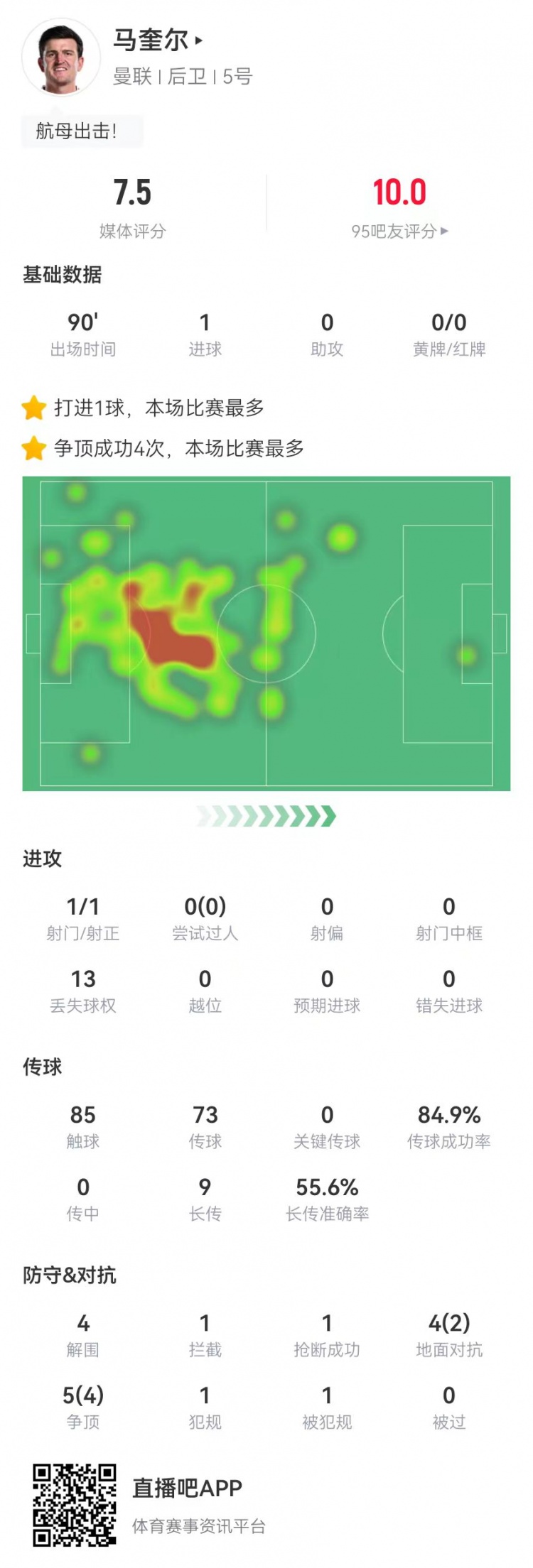 2月8日訊 曼聯(lián)在本輪足總杯2-1絕殺萊斯特城,馬奎爾本場(chǎng)數(shù)據(jù)如下:
