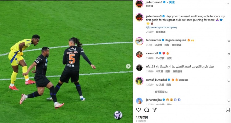 2月8日訊 利雅得勝利在本輪沙特超3-0輕取費哈,新援杜蘭首秀雙響建功并獲評官方本場最佳。他也在賽后通過社媒曬出自己的比賽照,并配文:“對勝利感到高興,也很開心能夠為這家的偉大俱樂部打進我的處子球,我們會繼續(xù)努力爭取贏得更多。” 本文標簽: 足球 利雅得勝利 五洲