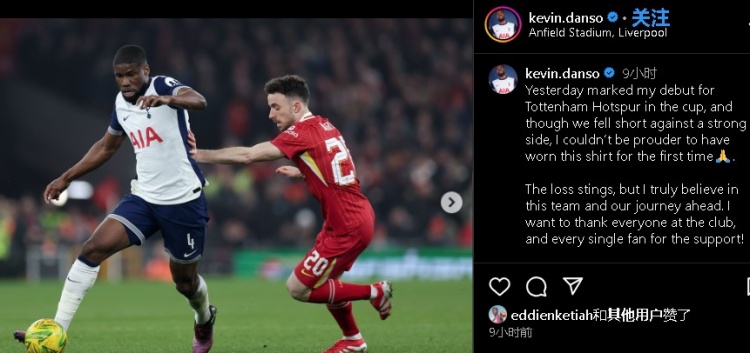 2月8日訊 英聯(lián)杯熱刺0-4利物浦,熱刺新援丹索首發(fā)登場。賽后,丹索更新社媒談到比賽。丹索社媒昨天是我首次為熱刺出戰(zhàn)杯賽,盡管我們輸給了一支強(qiáng)大的對手,但能第一次穿上這件球衣,我感到無比自豪????。這場失利令人痛心,但我真心對這支球隊以及我們的未來有信心。我想感謝俱樂部的每一個人,以及每一位球迷的支持!繼續(xù)前進(jìn)。熱刺加油! 本文標(biāo)簽: 足球 英超 熱刺