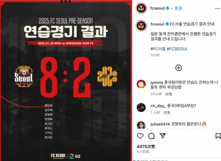 1月30日訊 今日,首爾FC與中乙球隊深圳二零二八進行了一場友誼賽,最終首爾FC8-2大勝。根據(jù)首爾FC曬出的最終比分圖,顯示本場比賽首爾FC新任隊長林加德出戰(zhàn),并且打進球隊第3和第4球,完成梅開二度。新賽季K1聯(lián)賽將于2月15日打響,首爾FC首輪將客場對戰(zhàn)濟州聯(lián)。 本文標(biāo)簽: 足球 深圳二零二八 中乙 中國足球 董路 K聯(lián)賽 五洲