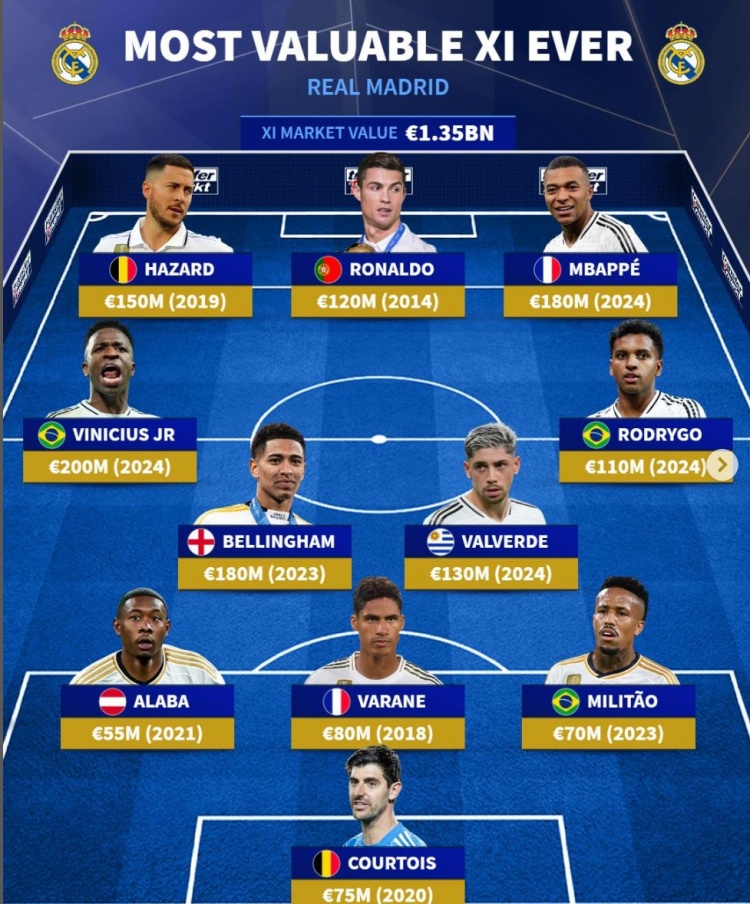 德轉(zhuǎn)列皇馬隊(duì)史身價(jià)最貴陣:總身價(jià)13.5億歐元