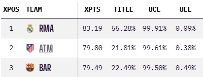 機(jī)構(gòu)目前預(yù)測(cè)本賽季最終皇馬積分將達(dá)到83分,馬競(jìng)和巴薩均為79分。