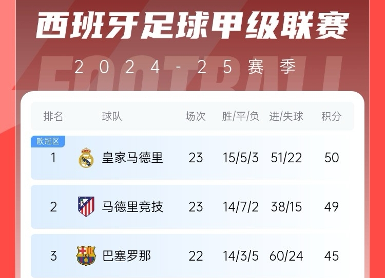 02月09日訊 西甲第23輪馬德里德比戰(zhàn)成1-1,這使得榜首三隊(duì)的爭(zhēng)冠形勢(shì)更具懸念。