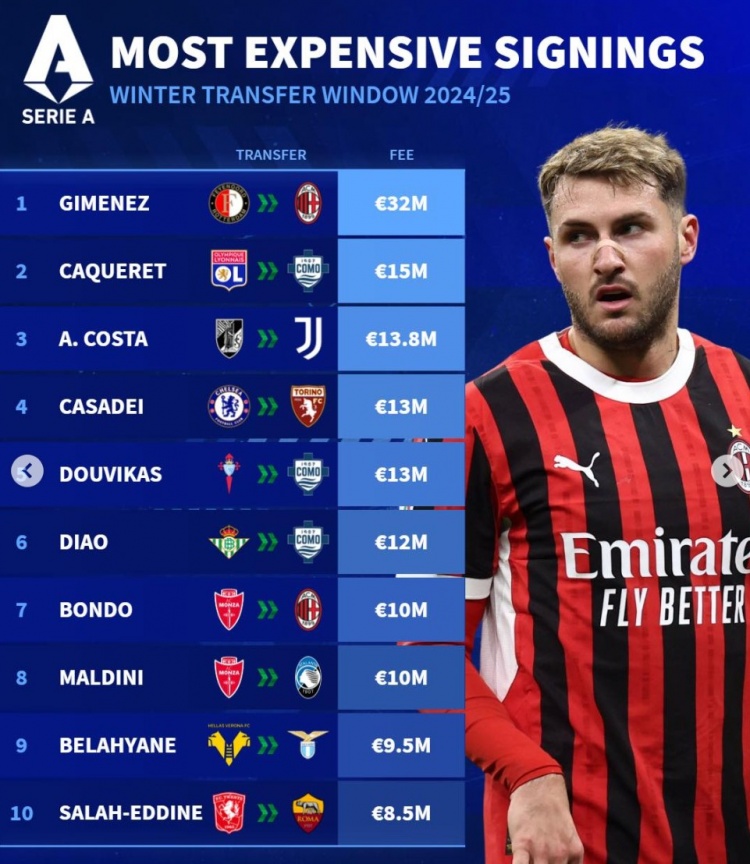 1.S-希門尼斯,費(fèi)耶諾德→米蘭,3200萬