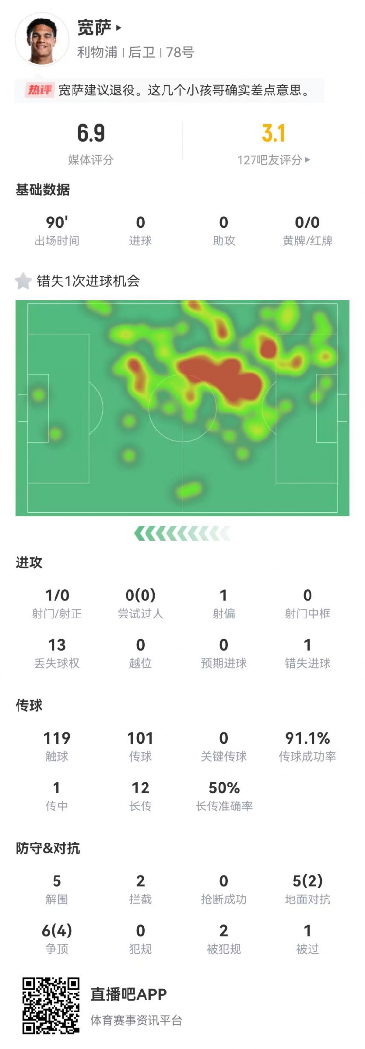 2月10日訊 利物浦在本輪足總杯0-1爆冷不敵普利茅斯,寬薩本場(chǎng)數(shù)據(jù)如下: