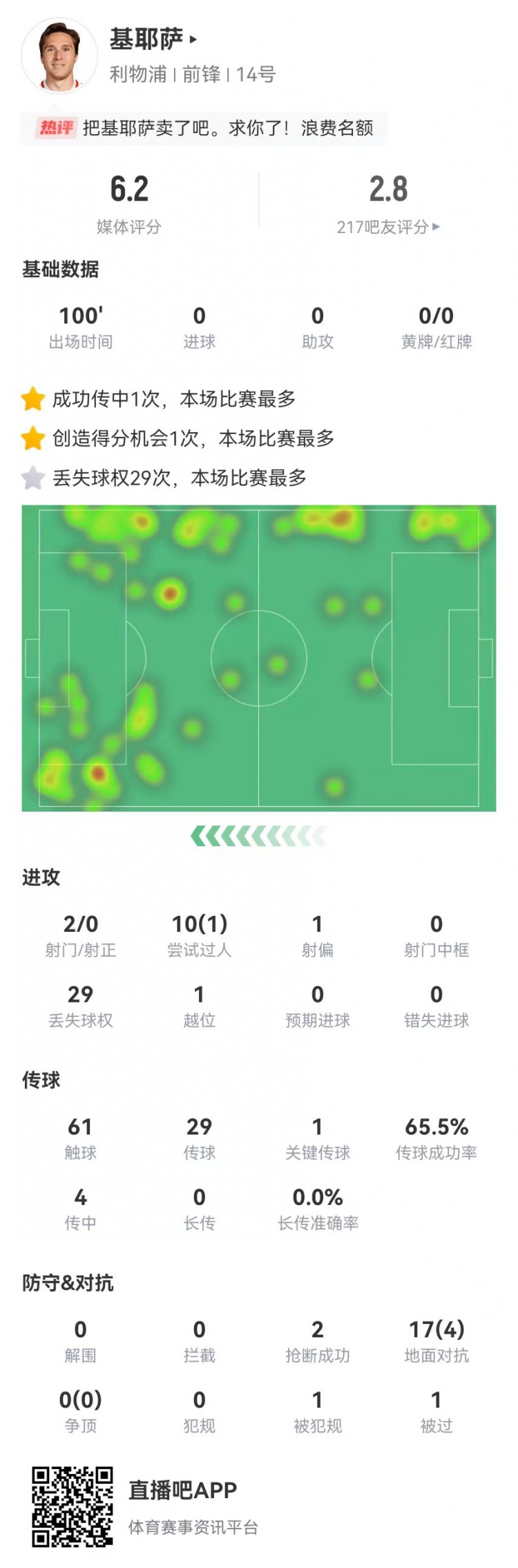 2月10日訊 利物浦在本輪足總杯爆冷0-1不敵普利茅斯,基耶薩本場數(shù)據(jù)如下:首發(fā)出戰(zhàn)100分鐘2射門、0射正10過人、1成功61觸球29傳球、19成功,成功率66%1關鍵傳球4傳中、1成功1創(chuàng)造重大機會17對抗、4成功29丟失球權1造犯規(guī)1越位2搶斷1被過獲評6.2分全場最低 本文標簽: 足球 英超 利物浦