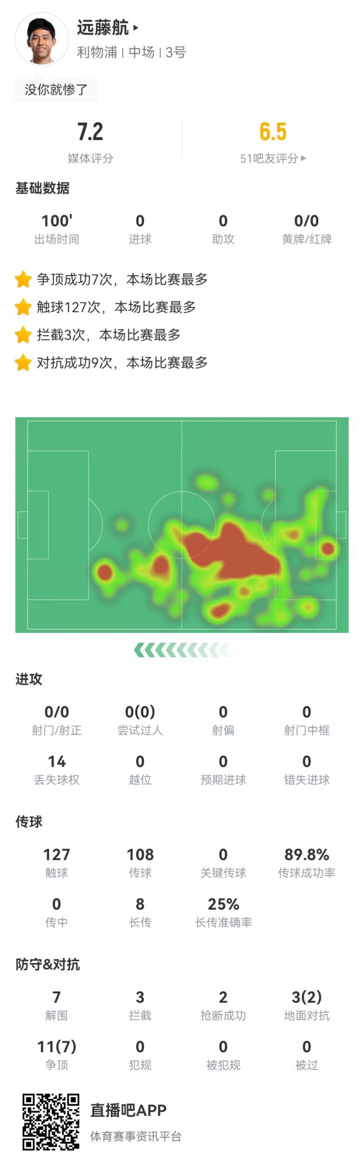 2月10日訊 利物浦在本輪足總杯0-1爆冷不敵普利茅斯,遠藤航本場數(shù)據(jù)如下:首發(fā)出戰(zhàn)100分鐘127觸球108傳球、97成功,成功率90%8長傳、2成功14對抗、9成功7解圍1封堵3攔截2搶斷0被過0犯規(guī)獲評7.2分 本文標簽: 足球 利物浦 英超