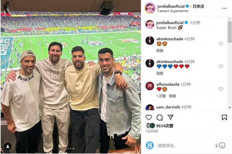 2月10日訊 阿爾巴更新社媒動態(tài),曬出與梅西等隊友現(xiàn)場觀看超級碗的合照。NFL超級碗今日進行,堪薩斯城酋長對陣費城老鷹,阿爾巴與梅西、蘇亞雷斯、布斯克茨一起現(xiàn)場觀戰(zhàn),他在社交媒體上曬出合照,配文:“超級碗。” 本文標簽: 足球 西甲 巴塞羅那 邁阿密國際 梅西