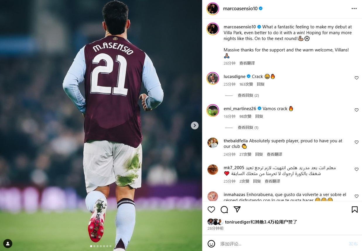 2月10日訊 阿斯頓維拉在本輪足總杯主場2-1擊敗熱刺,從巴黎租借而來的阿森西奧替補(bǔ)完成首秀。他也在賽后通過社媒曬出自己的比賽照,并配文:“在維拉公園的首次亮相真是太棒了,取得勝利讓這感覺更好了!期待未來能有更多這樣的夜晚。晉級下一輪!??????????非常感謝你們的支持和熱烈歡迎,維拉球迷們!” 本文標(biāo)簽: 足球 英超 熱刺 阿斯頓維拉 法甲 巴黎圣日耳曼