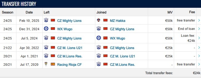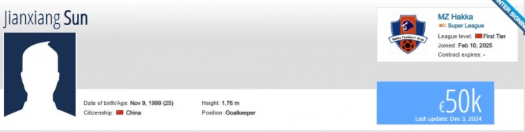2月10日訊 根據德轉頁面信息,前滄州雄獅門將孫健祥已自由轉會到梅州客家。