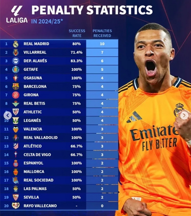2月11日訊 《轉(zhuǎn)會市場》統(tǒng)計了本賽季五大聯(lián)賽獲得點球次數(shù)情況,皇馬10次最多,狼隊和巴列卡諾至今為0。