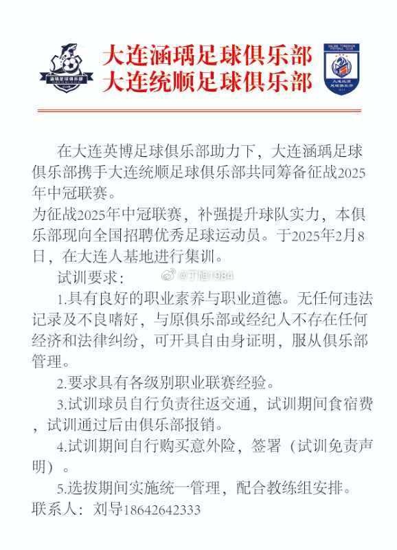 1月26日訊 據(jù)記者丁旭報道,中冠大連涵瑀足球俱樂部、大連統(tǒng)順足球俱樂部共同發(fā)布招聘球員公告。