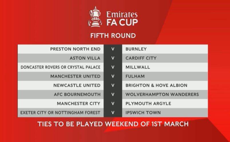 足總杯16強抽簽出爐,曼聯(lián)將對陣富勒姆,曼城將對陣普利茅斯,紐卡將對陣布萊頓。