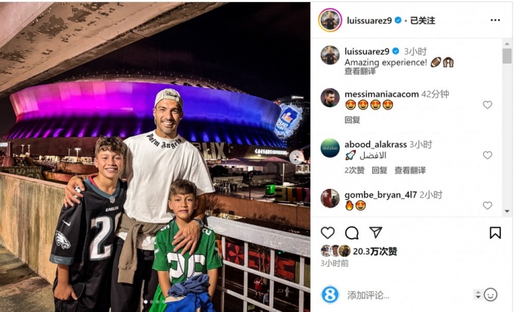 目前效力于邁阿密國(guó)際的蘇亞雷斯現(xiàn)場(chǎng)觀看了比賽,他在社交媒體上曬出與孩子在體育場(chǎng)外的合照,并配文:“很棒的體驗(yàn)。”