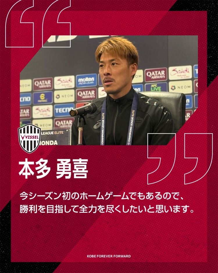 2月11日訊 北京時(shí)間今晚18:00,亞冠精英聯(lián)賽小組賽第7輪神戶勝利船將在主場(chǎng)迎戰(zhàn)上海海港。昨日神戶后衛(wèi)本多勇喜在球隊(duì)主帥吉田孝行的帶領(lǐng)下接受了采訪,對(duì)比賽進(jìn)行展望。