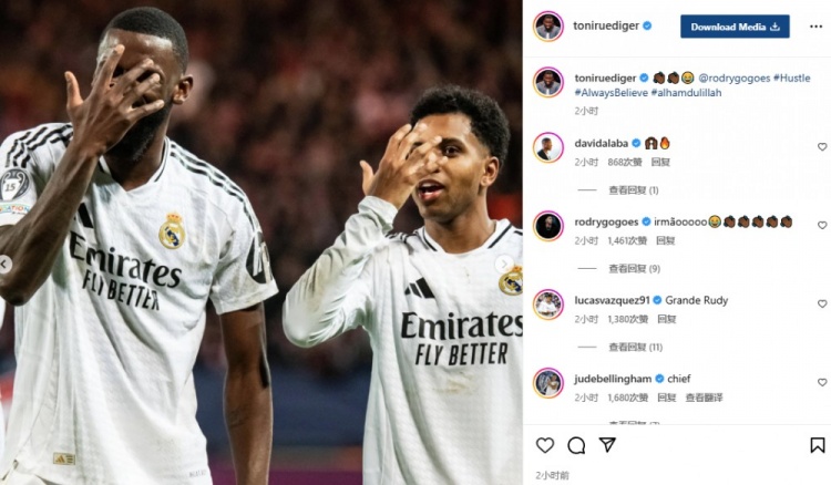 1月30日訊 在本輪歐冠,皇馬3-0客勝布雷斯特,羅德里戈完成雙響。賽后,呂迪格在社媒曬出和羅德里戈一起單手遮臉的慶祝手勢+并配上表情:????????????????????。