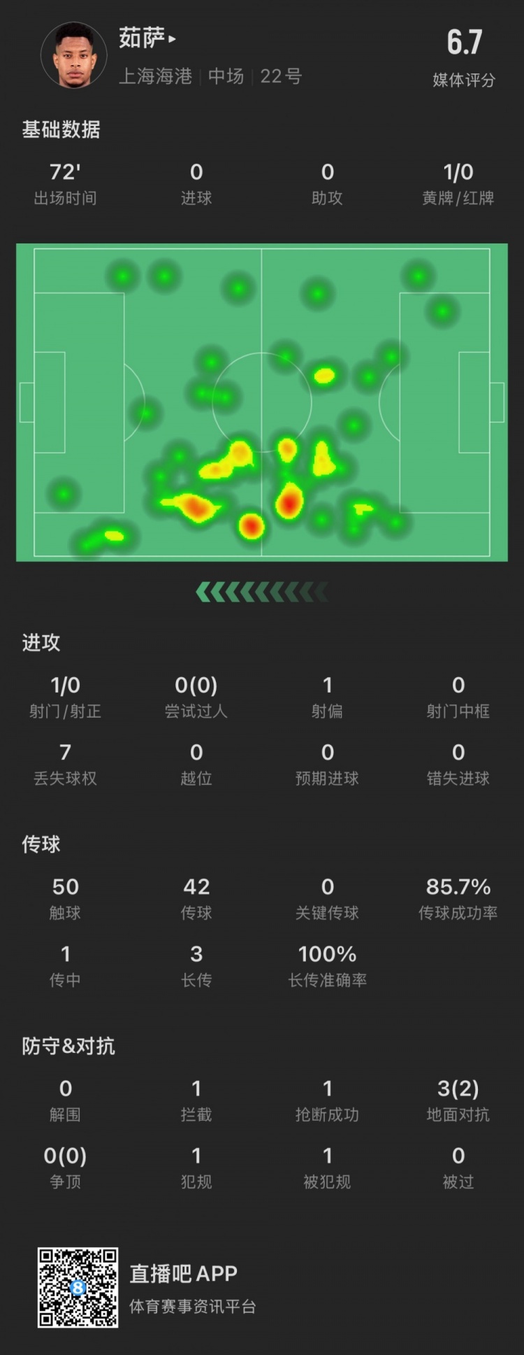本場比賽巴西外援茹薩為海港首發(fā)出戰(zhàn),在比賽第72分鐘時被換下,但未能幫助海港扭轉(zhuǎn)不利局面,最終他獲得6.7分的全場評分。