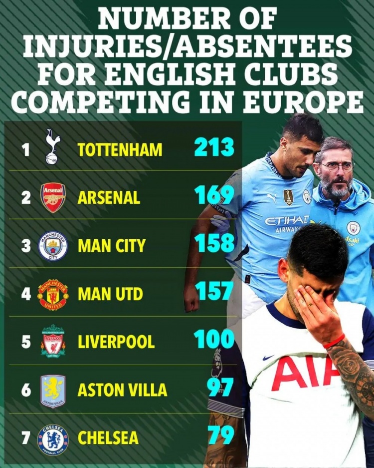 據(jù)統(tǒng)計,熱刺傷病比本賽季參加歐戰(zhàn)的任何英超球隊都要嚴(yán)重25%。在39場比賽中,熱刺總?cè)毕舜芜_到213人次,比排名第二的阿森納多出44人。