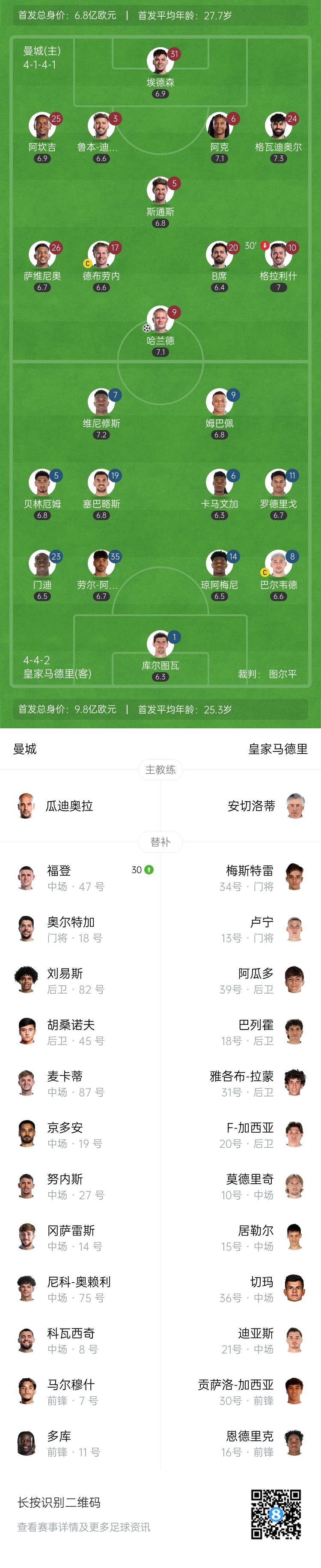 第19分鐘,格拉利什左路送出挑傳,格瓦迪奧爾胸部停球給哈蘭德,后者順勢推射得手,曼城1-0皇馬?!?/strong>