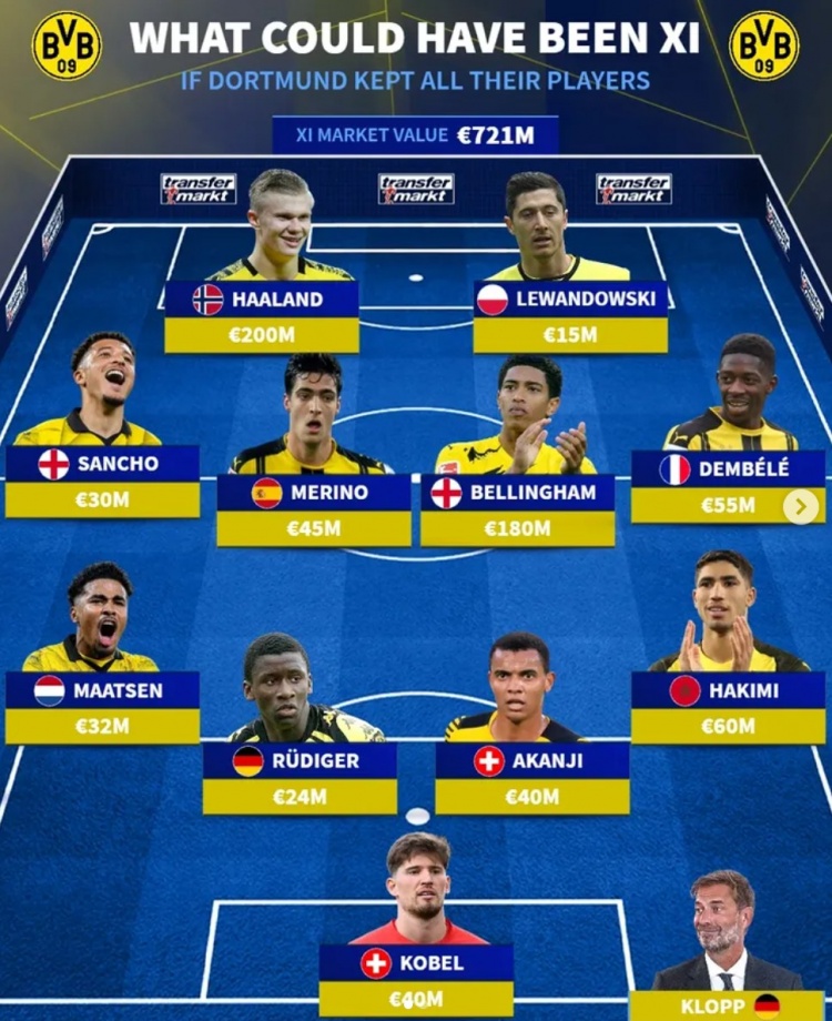 德轉列多特履歷當前最強陣:總身價7.21億歐元