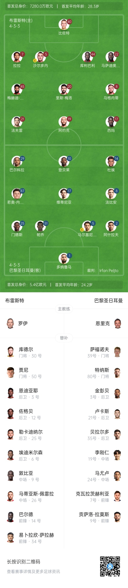 布雷斯特首發(fā):40-比佐特、5-沙爾多內(nèi)、20-里斯-梅洛、22-海達(dá)拉44-索瑪拉-庫利巴利、8-馬格內(nèi)蒂、21-法夫雷、45-馬赫迪-卡馬拉、17-西瑪、7-拉拉、19-阿約克
