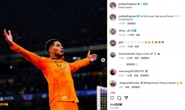 2月12日訊 皇馬在本輪歐冠3-2逆轉(zhuǎn)曼城,貝林厄姆補(bǔ)時打進(jìn)絕殺。本場比賽第90+2分鐘,劉易斯后場送禮,皇馬獲得反擊機(jī)會,維尼修斯單刀球挑射偏出,貝林厄姆快速前插將球打進(jìn)。貝林厄姆也在賽后通過社媒曬出自己經(jīng)典的張臂慶祝照,并配文:“一切遠(yuǎn)未結(jié)束。我們主場再見。馬德里前進(jìn)!” 本文標(biāo)簽: 足球 西甲 皇家馬德里 英超 曼城 歐冠