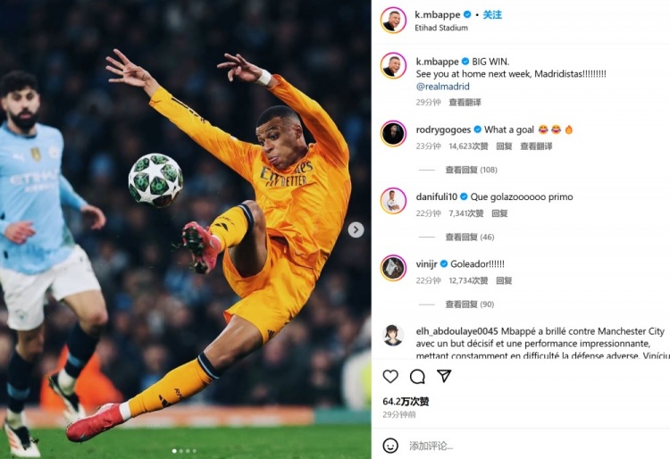 2月12日訊 皇馬在本輪歐冠客場3-2逆轉(zhuǎn)曼城,姆巴佩為球隊打進(jìn)關(guān)鍵進(jìn)球。第60分鐘,巴爾韋德主罰任意球爆射被封堵,塞巴略斯弧頂處送出挑傳,姆巴佩前插側(cè)身凌空射門得手。姆巴佩也在賽后通過社媒曬出自己射門瞬間的比賽照,并配文:“重要的勝利!下周主場再見,馬德里主義者們?。。。?!@皇馬俱樂部”。 本文標(biāo)簽: 足球 西甲 皇家馬德里 曼城 姆巴佩 歐冠 英超