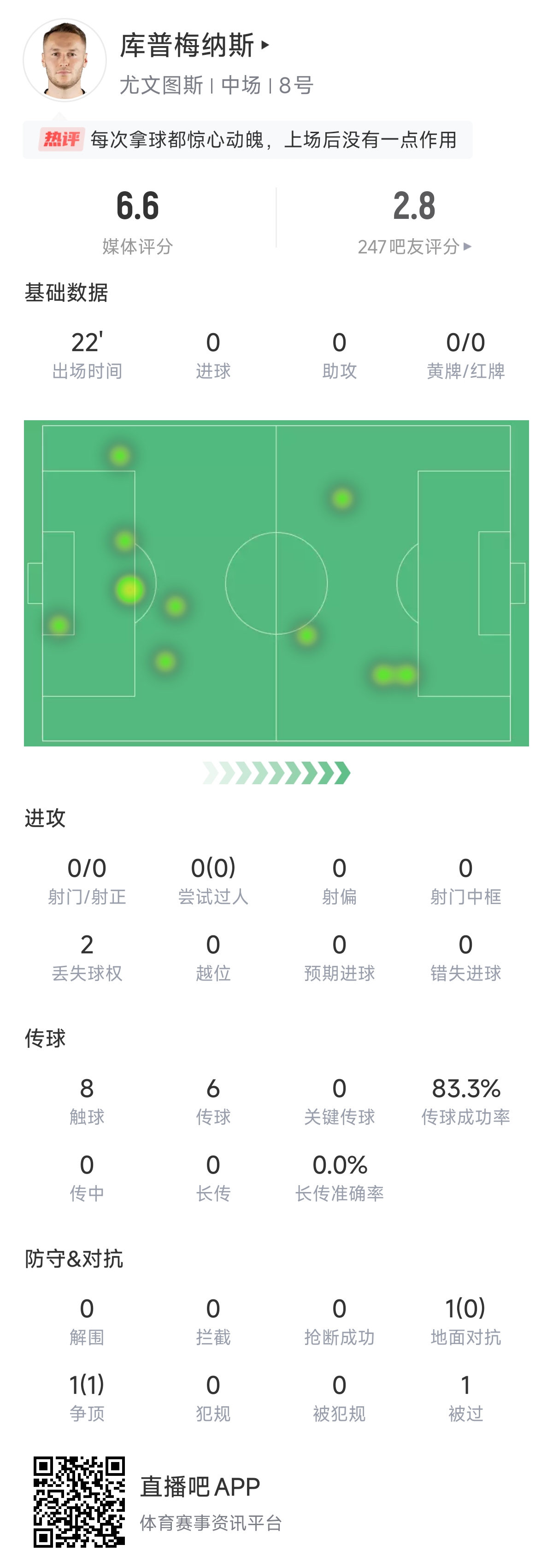 今天的比賽庫普梅納斯出戰(zhàn)26分鐘(含4分鐘補時),僅有8次觸球,其中2次丟失球權。他的多項數(shù)據(jù)掛零,1次對抗也沒成功。賽季即將進入沖刺期,這位26歲的荷蘭中場,能否找回自己上賽季的神勇狀態(tài)呢?
