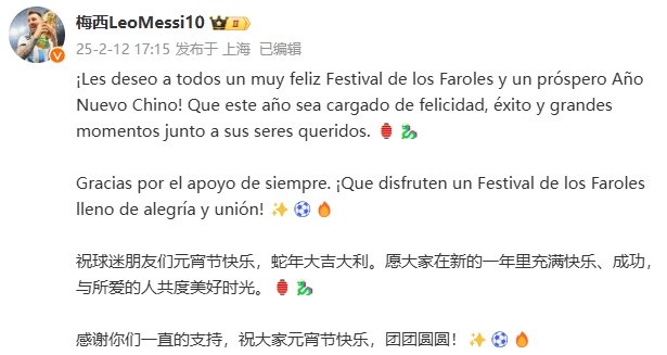 02月12日訊 今天是農(nóng)歷正月十五,中國傳統(tǒng)節(jié)日元宵節(jié),梅西在微博用西班牙語和中文為球迷送上了元宵祝福。