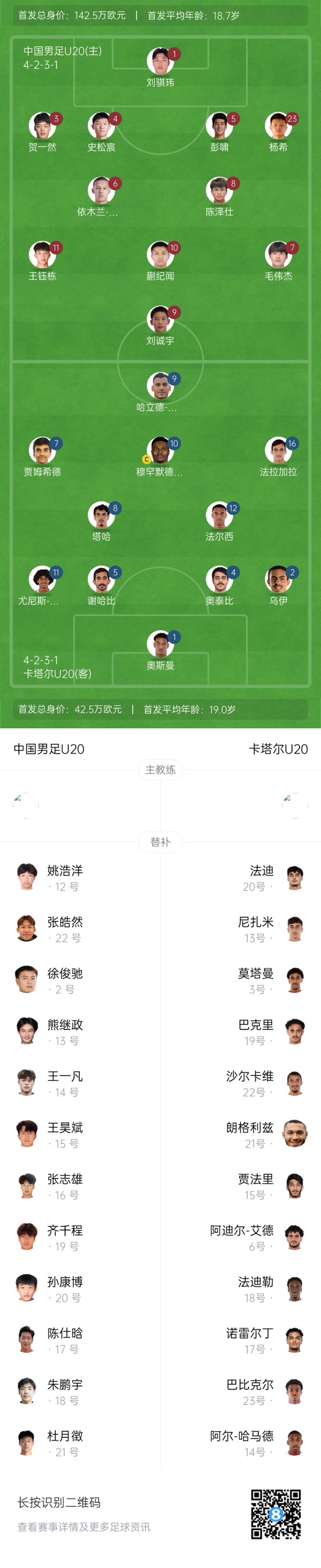 卡塔爾U20首發(fā):1-阿布貝克爾-奧斯曼、2-阿尤布-烏伊、4-奧泰比、5-謝哈比、11-尤尼斯-巴拉、12-法爾西、8-塔哈、10-易卜拉欣-穆罕默德-阿里、7-賈姆希德、9-古達(dá)、16-法拉加拉