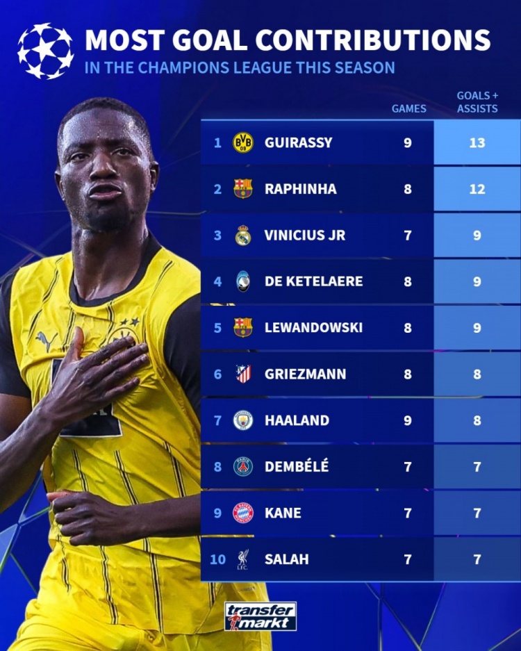 2月12日訊 德國(guó)轉(zhuǎn)會(huì)市場(chǎng)統(tǒng)計(jì)了本賽季球員在歐冠比賽中參與進(jìn)球的數(shù)量,并列出榜單,吉拉西參與13球居首,拉菲尼亞參與12球次席。