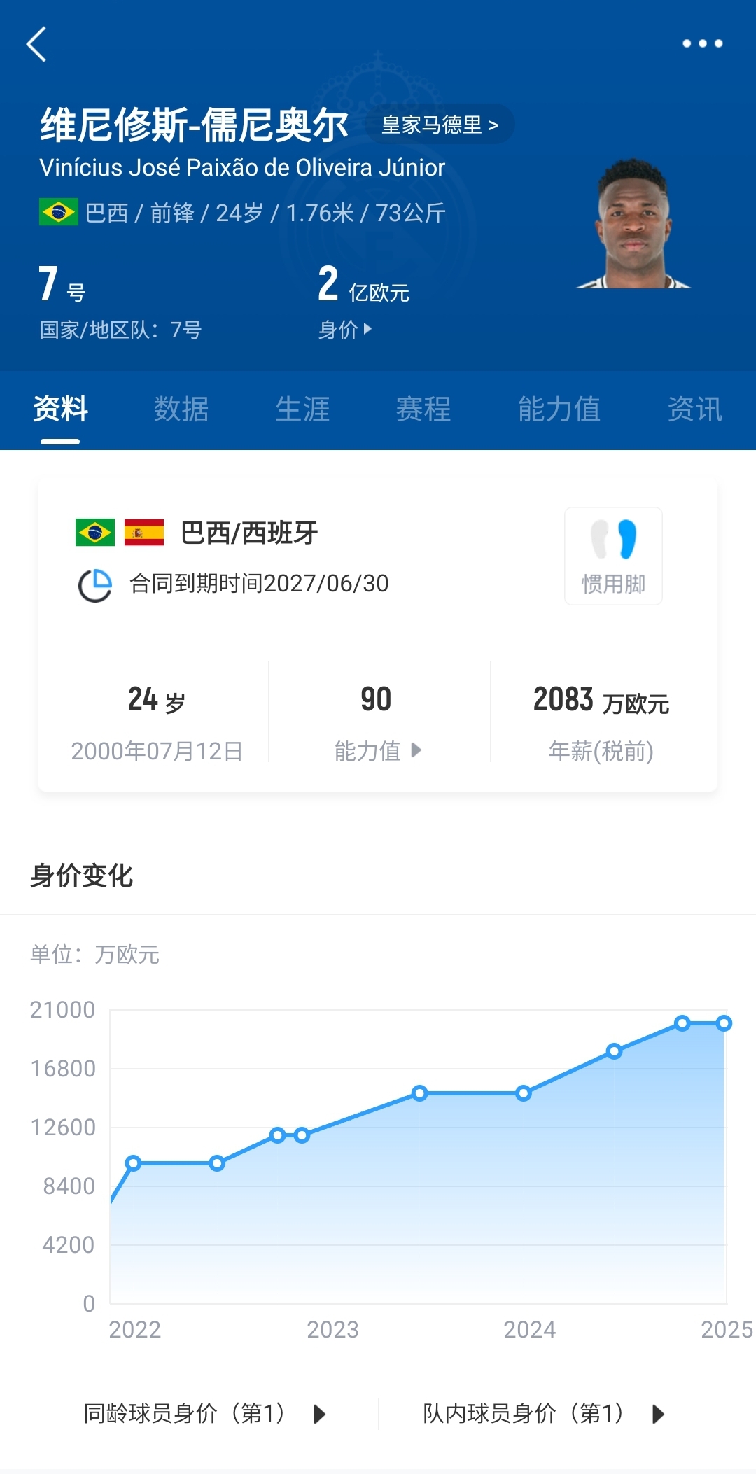 本賽季24歲的維尼修斯為皇馬出戰(zhàn)30場(chǎng)比賽,貢獻(xiàn)16球11助,目前球員德轉(zhuǎn)身價(jià)2億歐。