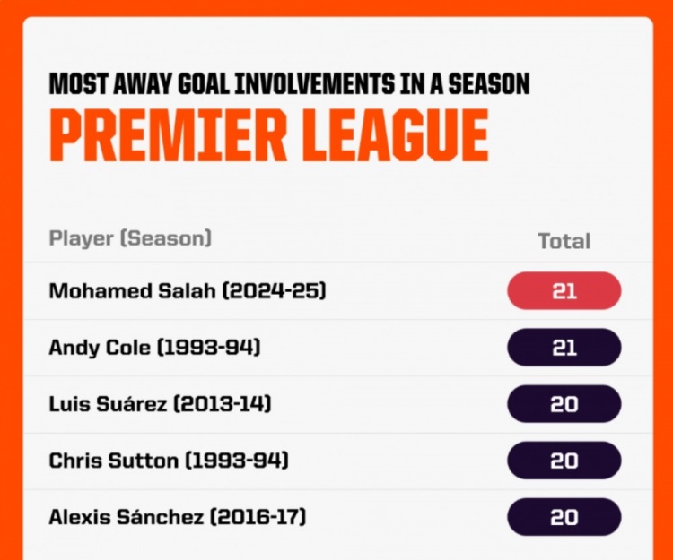 2月12日訊 Opta統(tǒng)計(jì)了球員單賽季在英超客場比賽中參與進(jìn)球的數(shù)量,并列出榜單,本賽季薩拉赫參與21球(13球8助),與科爾并列排名首位。單賽季英超客場參與進(jìn)球榜:薩拉赫(2024-2025)——21安迪-科爾(1993-1994)——21蘇亞雷斯(2013-2014)——20薩頓(1993-1994)——20桑切斯(2016-2017)——20 本文標(biāo)簽: 足球 英超 利物浦 薩拉赫