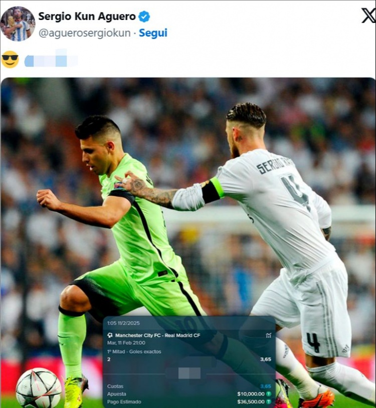 阿圭羅經(jīng)常會在社交媒體上曬出自己對足球比賽進行下注的票根,他也在昨天曼城2-3輸給皇馬的歐冠附加賽首回合進行了下注,他下注了1萬美金,買上半場剛好以2粒進球結(jié)束,賠率3.65倍。