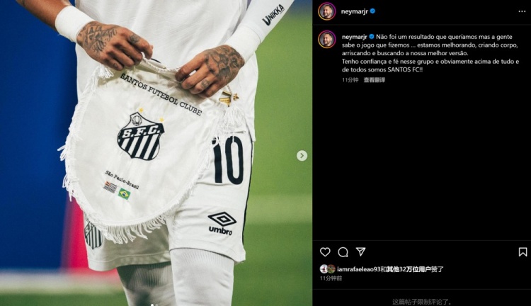 內(nèi)馬爾寫道:“比賽的結(jié)果并不理想,但我們知道自己的比賽方式.....我們正在改進(jìn)、增強(qiáng)實(shí)力,承擔(dān)風(fēng)險(xiǎn)并找到我們最好的狀態(tài)。我對(duì)這個(gè)球隊(duì)充滿信心,顯然最重要的是,我們是桑托斯足球俱樂(lè)部?。 ?/p>