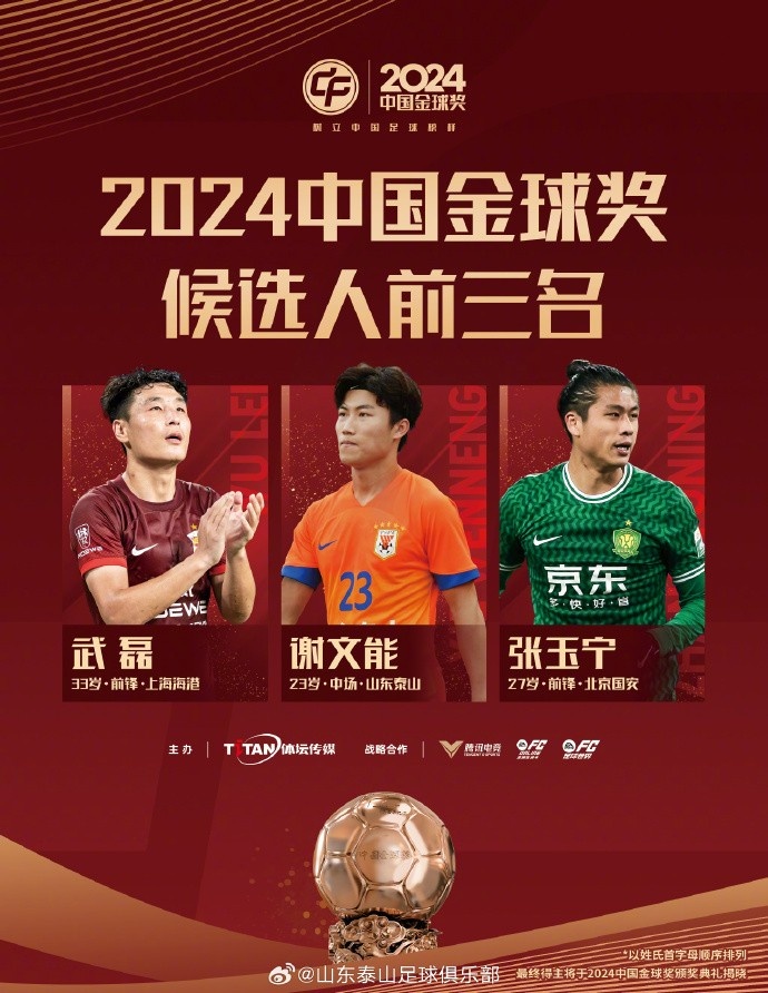 同時(shí),山東泰山隊(duì)的謝文能也入選2024中國金球獎(jiǎng)候選人前三名。期望王大雷和謝文能在俱樂部和國家隊(duì)的比賽中繼續(xù)發(fā)揚(yáng)頑強(qiáng)拼搏、永不放棄的泰山足球精神,用他們的實(shí)力和激情為中國足球貢獻(xiàn)力量。