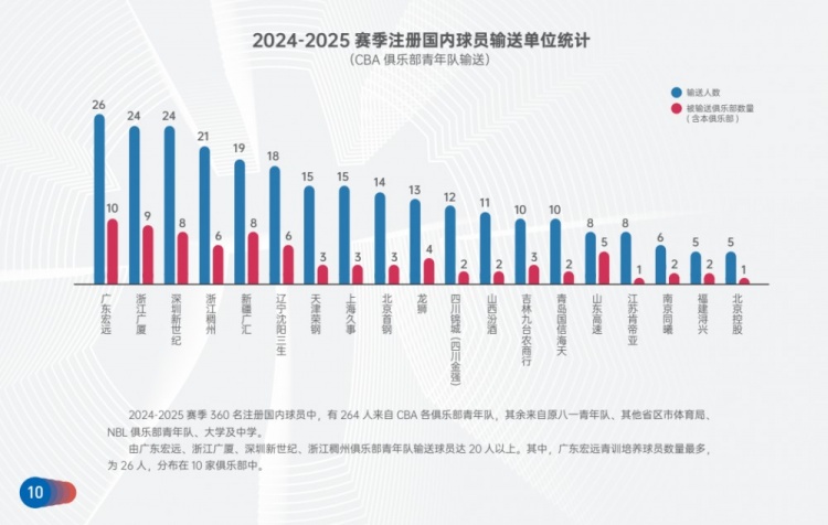 2024-2025賽季 360 名注冊國內(nèi)球員中,有264人來自CBA各俱樂部青年隊,其余來自原八一青年隊、其他省區(qū)市體育局、NBL俱樂部青年隊、大學(xué)及中學(xué)。