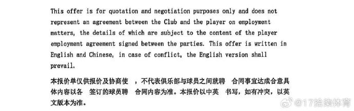 二 多家俱樂部對哈雷爾感興趣并進行了談判,其間另一家中方經紀公司在浙江稠州銀行俱樂部與哈雷爾的談判過程中簽訂了一份報價單,其中明確約定“該報價單僅供報價和協(xié)商使用,不代表球員與俱樂部完成聘用合同簽約?!薄@也是浙江稠州銀行俱樂部多次公告中含糊其辭提及的“簽約”。最后,在多家俱樂部中談判協(xié)商中球員哈雷爾于二月十日選擇了簽約新疆廣匯俱樂部,三方按中國籃協(xié)和CBA公司要求簽訂了標準合同并在中國籃協(xié)完成了經紀人備案。