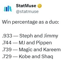 3月16日訊 NBA常規(guī)賽,勇士97-94力克尼克斯,豪取7連勝。至此,庫里和巴特勒共同出戰(zhàn)的比賽戰(zhàn)績?yōu)?4勝1負(fù),勝率高達(dá)93.3%。美媒則曬出三組傳奇搭檔勝率進(jìn)行對(duì)比:喬丹+皮蓬——74.4%魔術(shù)師+賈巴爾——73.9%科比+奧尼爾——72.9% 本文標(biāo)簽: 籃球 NBA 勇士 庫里 巴特勒 喬丹 科比 奧尼爾