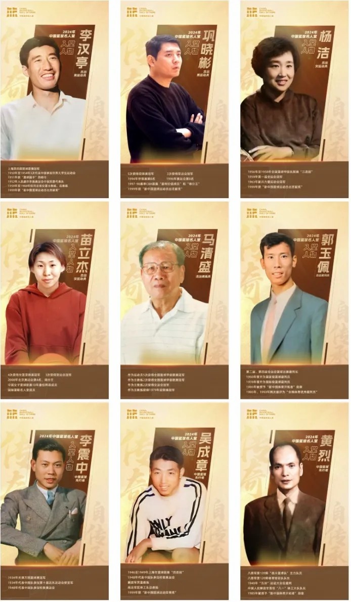 2024年中國籃球名人堂共產(chǎn)生9位入堂人物,杰出男運(yùn)動(dòng)員為:李漢亭、鞏曉彬;杰出女運(yùn)動(dòng)員為:楊潔、苗立杰;杰出教練員為:馬清盛;杰出裁判員為:郭玉佩;中國籃球先行者為:李震中、吳成章、黃烈。