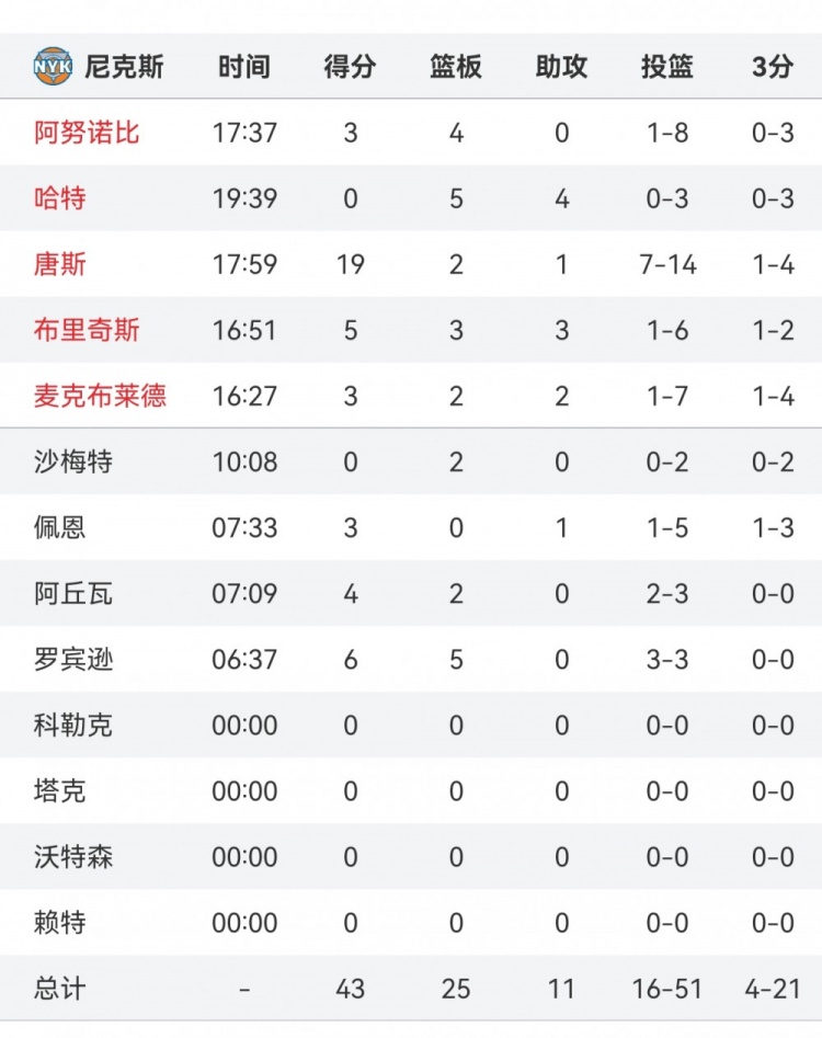 3月20日訊 NBA常規(guī)賽,尼克斯半場(chǎng)43-67落后馬刺。半場(chǎng)比賽,尼克斯首發(fā)除了唐斯以外都表現(xiàn)不佳,投籃共計(jì)24中3,共得到11分。 本文標(biāo)簽: 籃球 NBA 尼克斯 唐斯