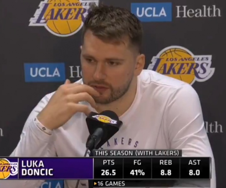 本賽季至今,東契奇在湖人(16場比賽)場均26.5分8.8籃板8助攻1.9搶斷,命中率41%。